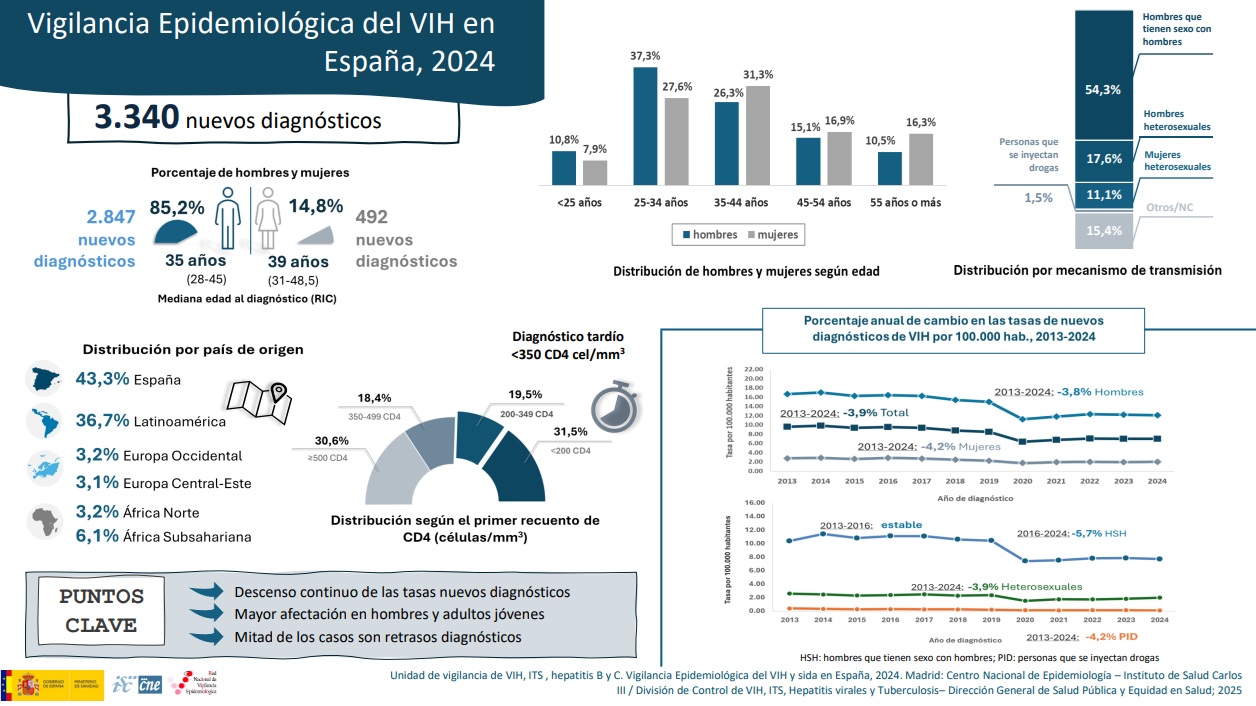 • La tendencia de nuevos diagnósticos de VIH en España es descendente entre 2013 y 2024.