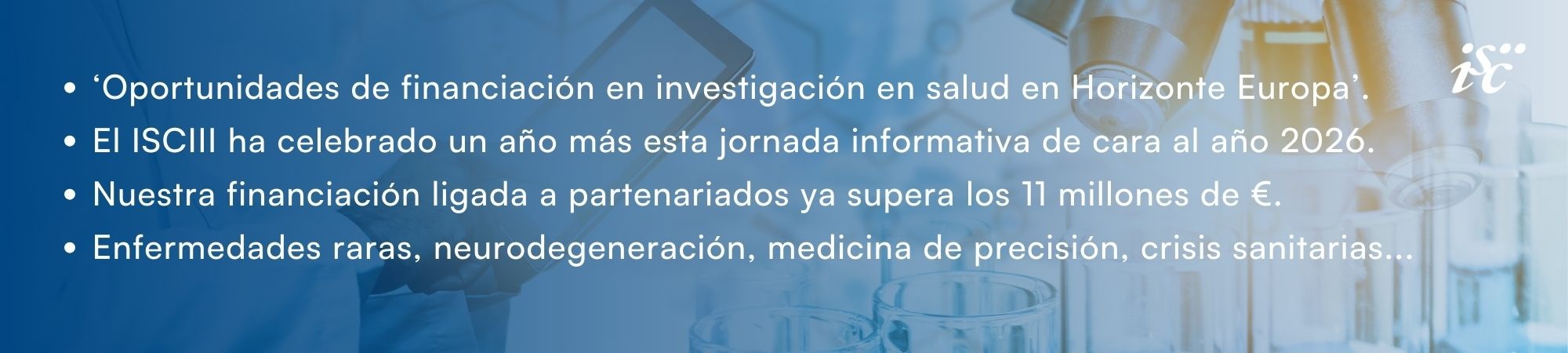 • Partenariado EP BRAIN HEALTH. El ISCIII es socio. Convocatorias ‘JTC2026 Call 1: Neurological Mental Sensory Disorders’ (450.000 €) y ‘JTC2026 Call 2: Neurodegenerative Disorders’ (300.000 €).