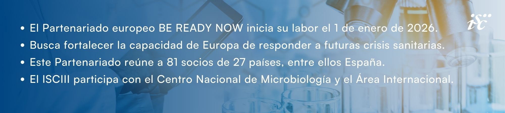 El Instituto de Salud Carlos III (ISCIII), a través de su Centro Nacional de Microbiología y la Subdirección General de Programas Internacionales de Investigación, gestiona y coordina la participación española en el partenariado europeo BE READY NOW para la preparación ante crisis sanitarias. Su principal objetivo es garantizar que Europa esté mejor preparada ante el posible surgimiento de epidemias o pandemias durante los próximos 10 años.