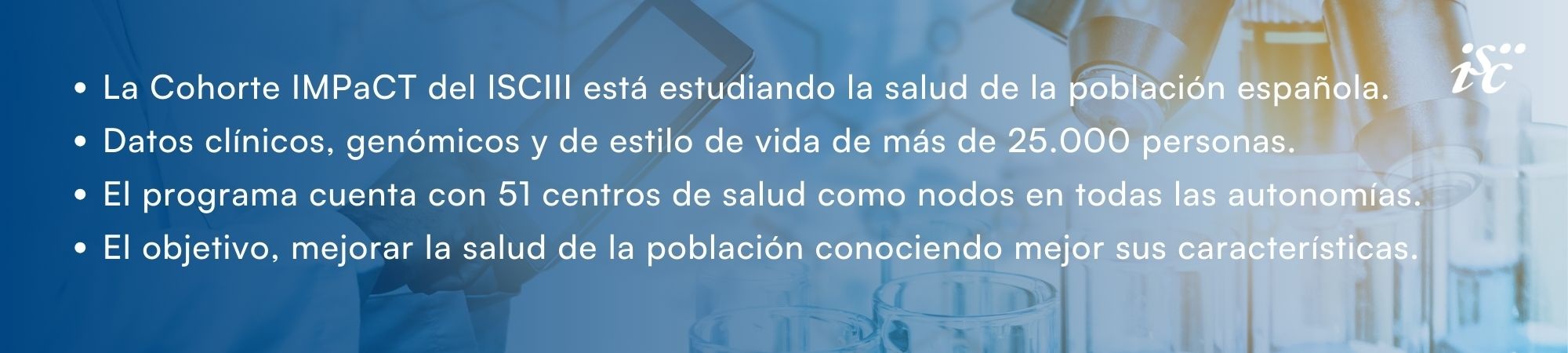 La Cohorte IMPaCT es una iniciativa del ISCIII, como organismo dependiente del Ministerio de Ciencia, Innovación y Universidades, coordinada desde el Centro de Investigación Biomédica en Red (CIBER-ISCIII). Está llevando a cabo un seguimiento que llegará hasta las 200.000 personas durante 20 años, en 51 centros de atención primaria repartidos por toda España, para impulsar la medicina predictiva y la prevención, y para mejorar la salud de la población española.