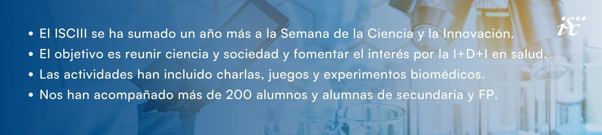 La Semana de la Ciencia en el ISCIII es una de las numerosas iniciativas de divulgación científica que organiza el Instituto a lo largo del año. La Unidad de Cultura Científica desarrolla diversas actividades en este sentido, abiertas al público general y/o enfocadas a centros educativos, ligadas a celebraciones como la Noche Europea de los Investigadores e Investigadoras, el Día de la Mujer y la Niña en la Ciencia y la Semana de la Administración Abierta, entre otras.
